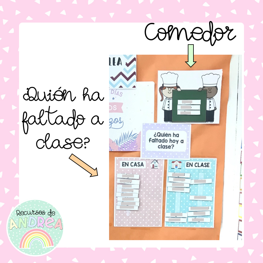 -Dos láminas una con los alumnos que hay en clase y otra con los que han faltado. Yo las he usado pegando una de velcro en el centro para poder colocar los nombres de los alumnos donde corresponda.