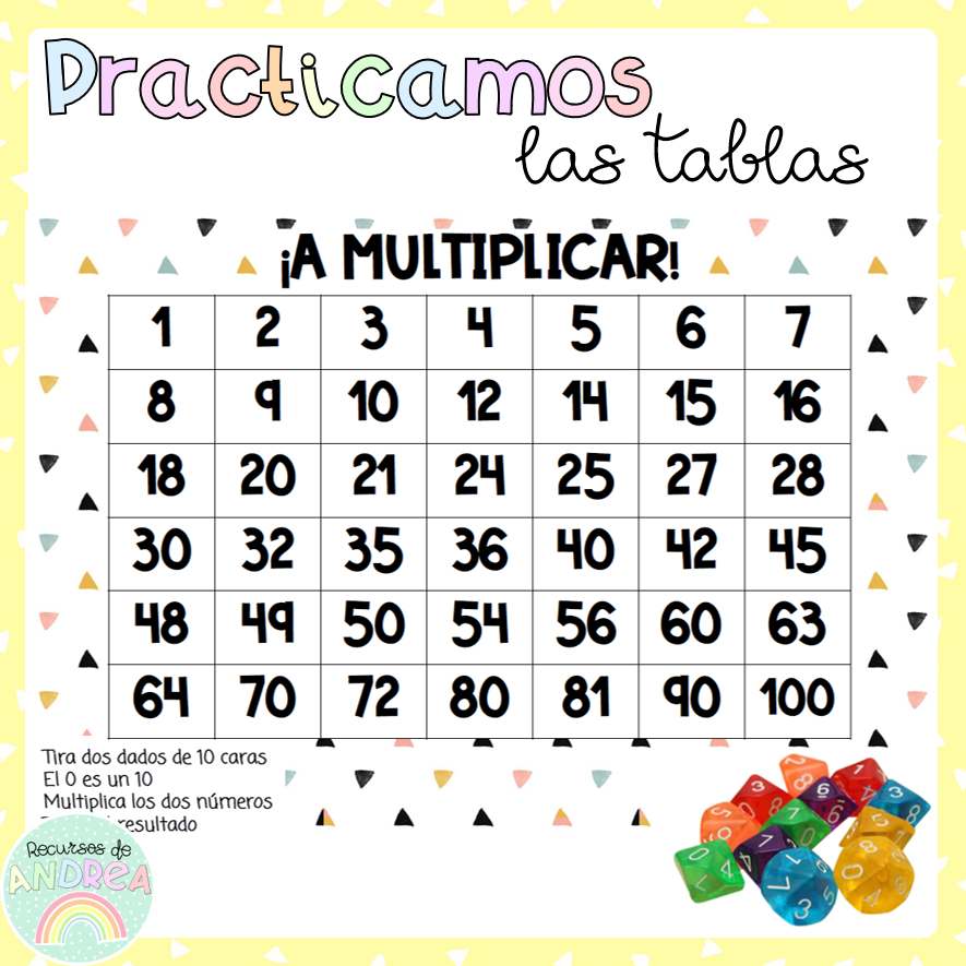Tablero para practicar las tablas de multiplicar con dados de 10 caras.